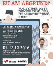 EUROPA AM ABGRUND? EINE VERANSTALTUNG MIT SAHRA WAGENKNECHT UND FABIO DE MASI Wohin steuert die EU mit Brexit, CETA, Euro- und Flüchtlingskrise?